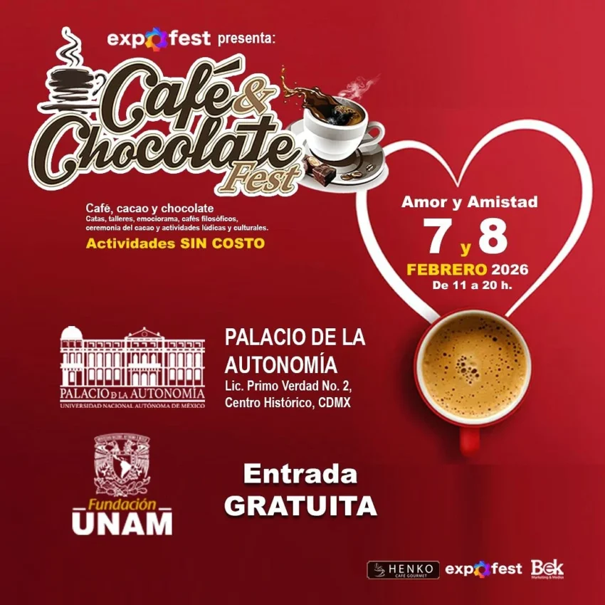 El Café y Chocolate Fest se llevará a cabo en el Palacio de la Autonomía UNAM, espacio de la Fundación UNAM, con entrada gratuita y un horario de 11:00 a 20:00 horas, convirtiéndose en una opción ideal para disfrutar en pareja, con amigos o en familia.
