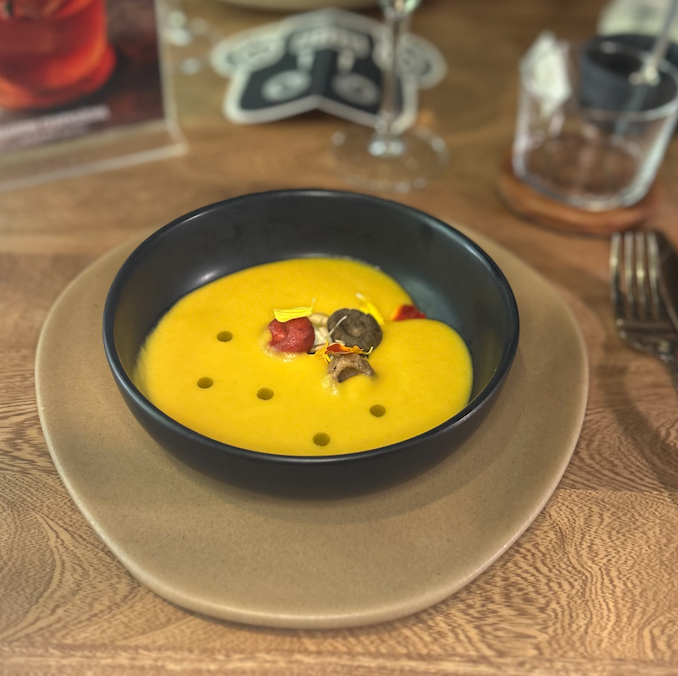 Servida con chochoyotes de maíz azul y blanco, queso azul, pétalos de cempasúchil y pepita de calabaza, esta sopa cremosa equilibra lo tradicional con lo contemporáneo.