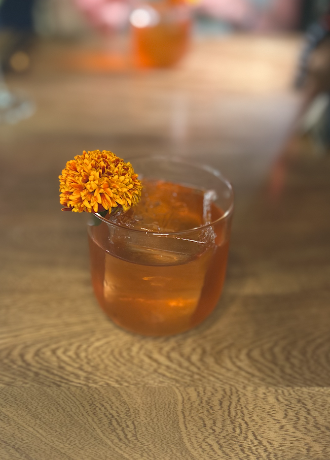 El maridaje ideal: el Cóctel Negroni Cempasúchil, preparado con mezcal Los Danzantes Joven Espadín, ginebra herbal, licor de cempasúchil, Aperol y un toque de bitters de naranja.