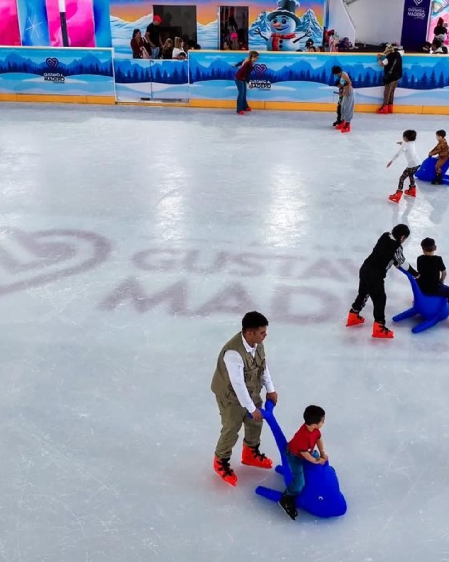 La joya del parque es la pista de hielo gratis, que permite que 100 personas patinen al mismo tiempo, con préstamo de patines incluido y gradas para que los más pequeños observen con seguridad.