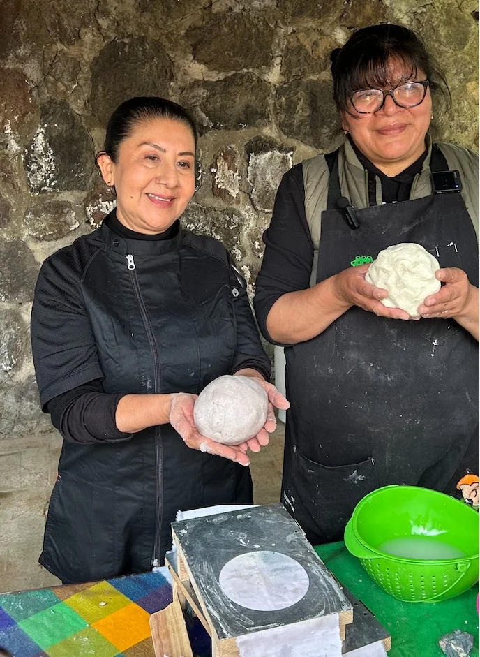Nuestra tarde comenzó con una visita a la cocina abierta, donde conocimos todo el proceso para obtener masa blanca, azul y roja: desgranar el maíz, limpiarlo, nixtamalizarlo, amasarlo y, finalmente, llevarlo al paladar —para nuestra fortuna— en forma de tamales y sopecitos con frijoles y salsa verde.