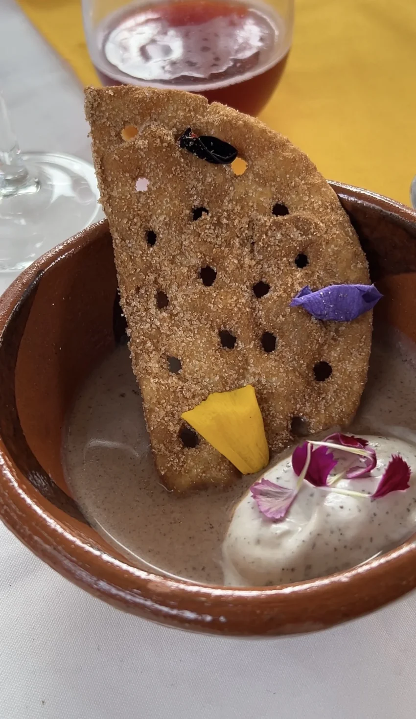 Dejen espacio para el postre. A nosotros nos sirvieron sopa de chocolate oaxaqueño, acompañada de buñuelo a la canela y crema de tabaquillo. Chopeamos, sorbimos y sonreímos.