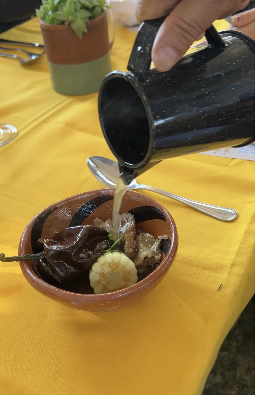 Después vino un caldo de gallina con cerdo, calabaza tamala y elote, coronado con chilhuacle, un chile oaxaqueño “de ceremonia” que picaba más que muchísimo, razón por la cual una buena parte terminó en la composta. Este chile es de alto valor culinario.