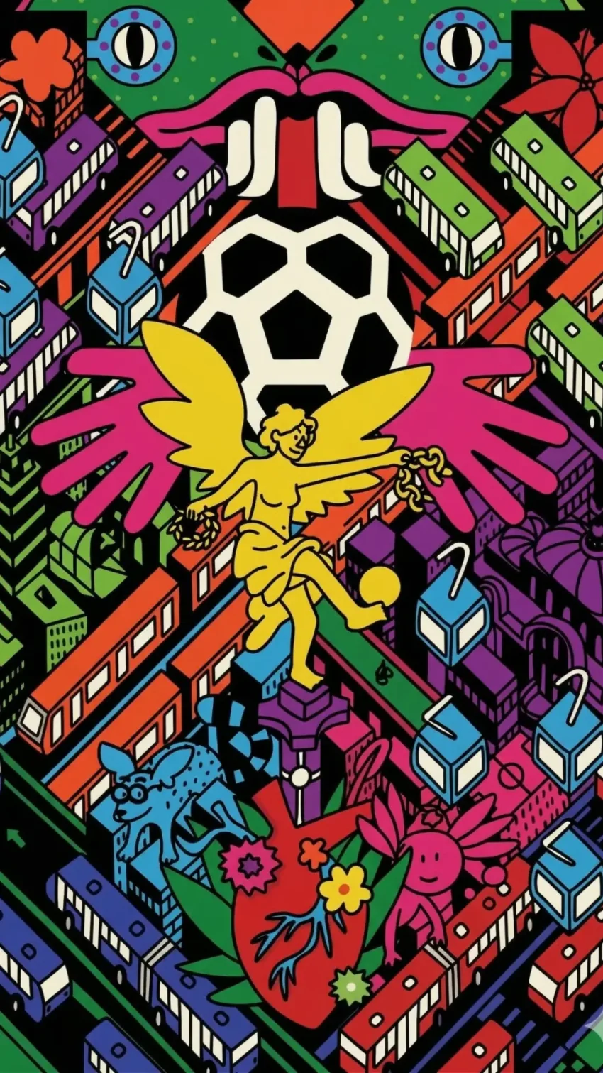 En el centro de la tarjeta aparece el Ángel de la Independencia jugando con un balón de futbol, acompañado de un diseño colorido que incluye un balón del que emergen manos en señal de bienvenida.
