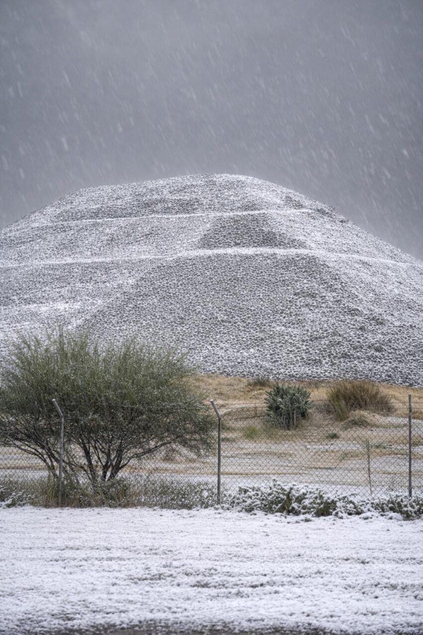 Aunque no se trató de nieve, la acumulación de granizo fue suficiente para que la Pirámide del Sol, la Pirámide de la Luna y áreas cercanas a la Calzada de los Muertos lucieran con una capa clara que contrastaba con la piedra volcánica.