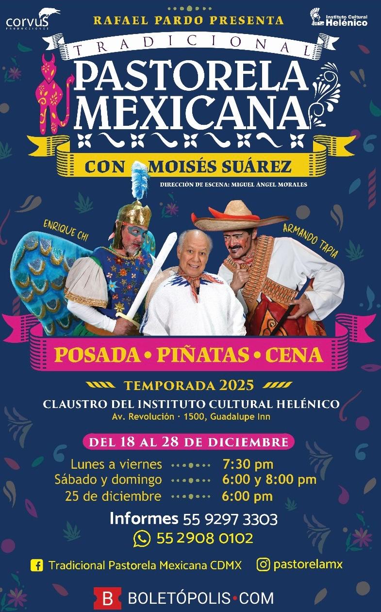 La Tradicional Pastorela Mexicana vuelve una vez más al Claustro del Helénico, con Moisés Suárez y un elenco lleno de energía. Una experiencia navideña con posada, piñatas, música en vivo y el encanto único de nuestras costumbres.