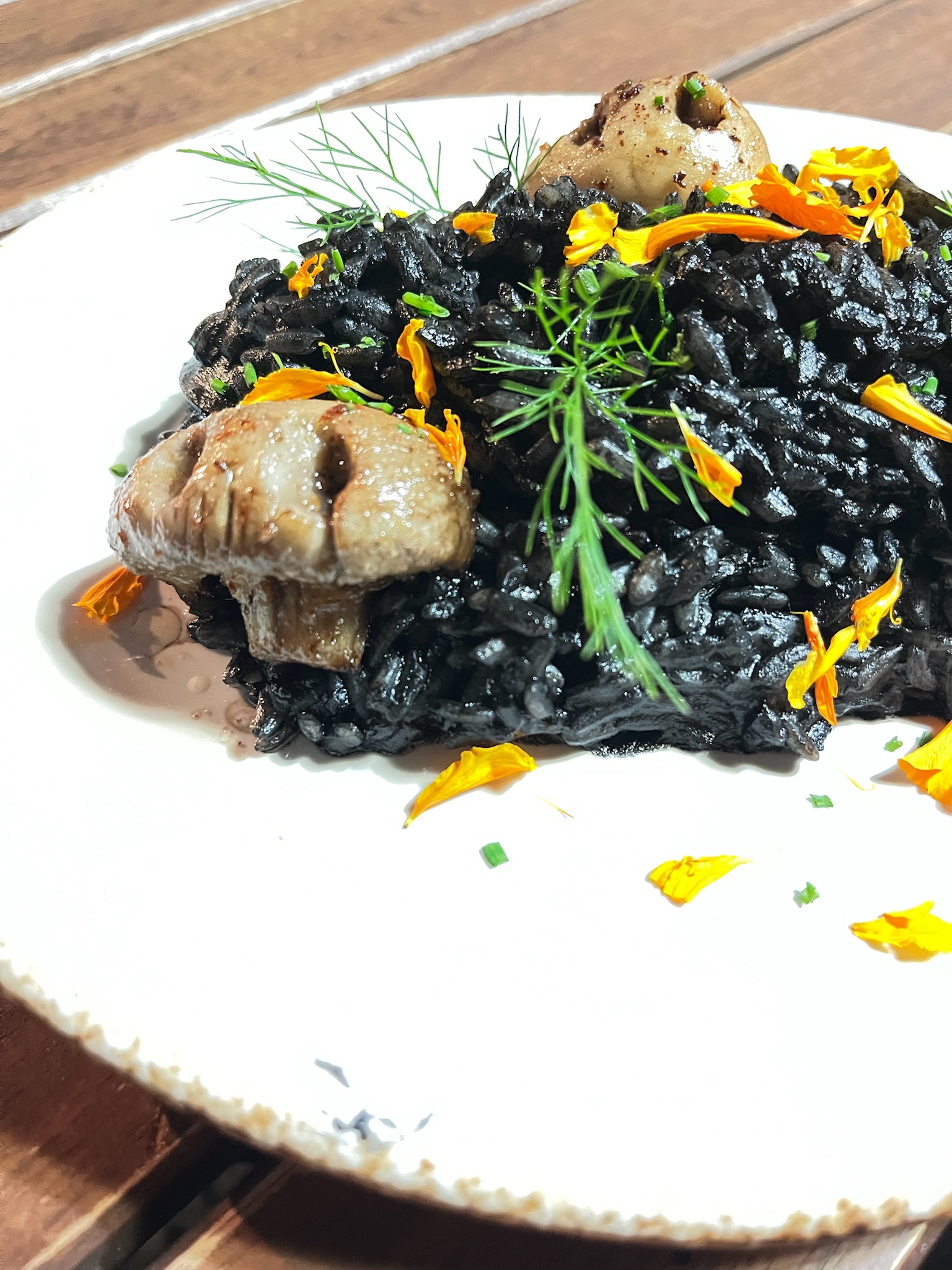 Y para cerrar, el plato que ya es insignia: el risotto negro, teñido con tinta de calamar y coronado con hongos y flores de cempasúchil. Es untuoso, con ese punto entre el mar y la tierra que define la esencia del lugar.