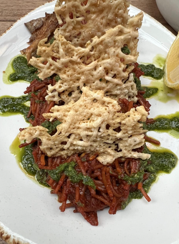El fideo seco a los tres chiles tiene carácter, pero sin agresividad. La pasta, sofrita con adobo de chiles y acompañada de crocantes de parmesano y pesto, se transforma cuando se exprime el limón que viene al lado: el ácido amarra todos los sabores.