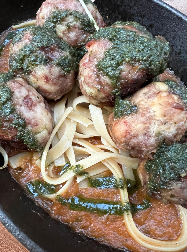 El pollo al grill sobre puré rústico y las albóndigas al pomodoro muestran el lado más honesto del menú: cocina de campo sin pretensión, hecha con oficio. Las albóndigas combinan cerdo y res, se hornean lentamente y guardan un interior jugoso con notas herbales.