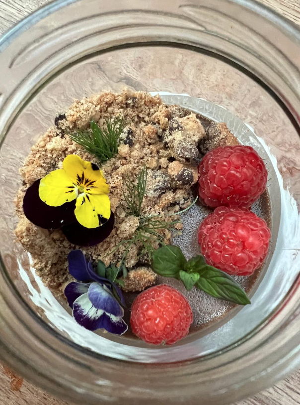 Luego llega a la mesa el mousse de chocolate se sirve como un pequeño terrario comestible: tierra de cacao, frutos frescos y una textura aterciopelada en la lengua.