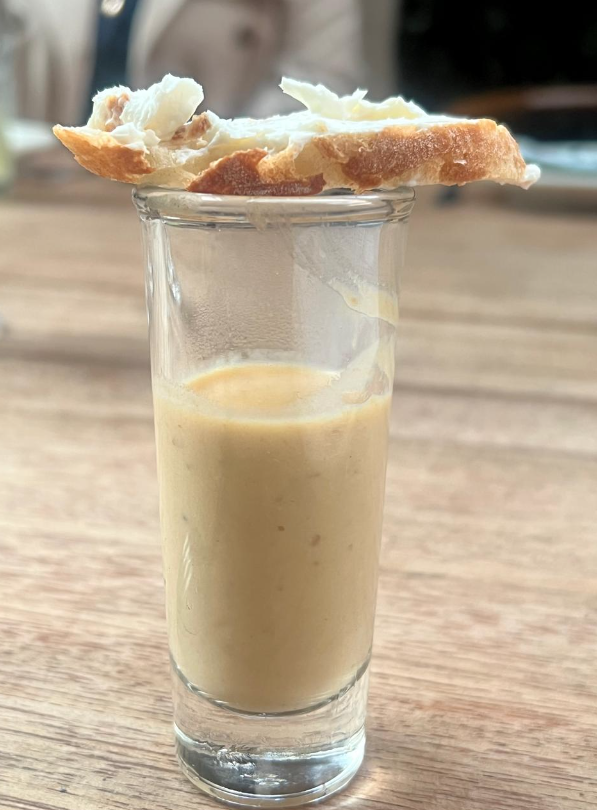 La experiencia comienza con un “caballito” de crema de calabaza de Castilla, suave y ligeramente dulce, acompañado de un crocante de pan de masa madre y un cremoso de cabra. Sabe a cosecha reciente y abre el apetito con discreción.